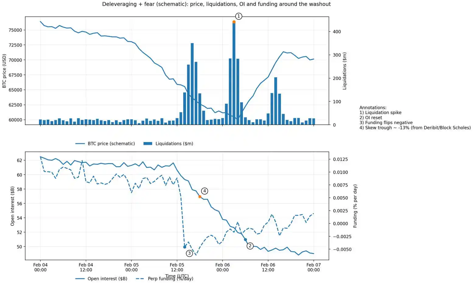 比特幣去槓桿圖表,顯示了清算激增、持倉量從 620 億美元重置至 490 億美元、負資金費率以及偏度觸及 -13%。