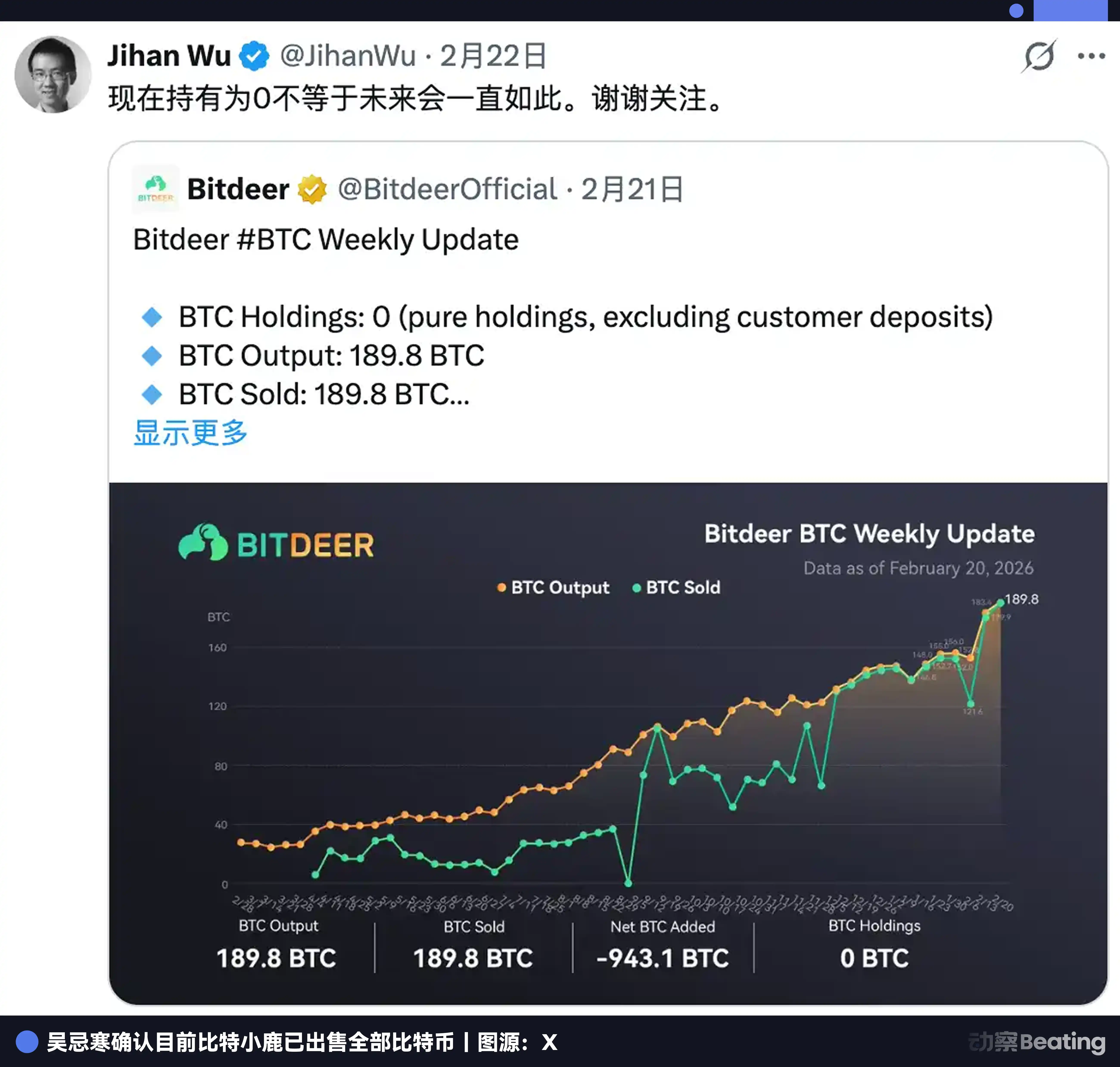2026 年 2 月 20 日,比特小鹿在 X 上發布了當週產量更新:當週自挖 189.8 枚 BTC,已售出。剩餘庫存 943.1 枚,一次性售出。