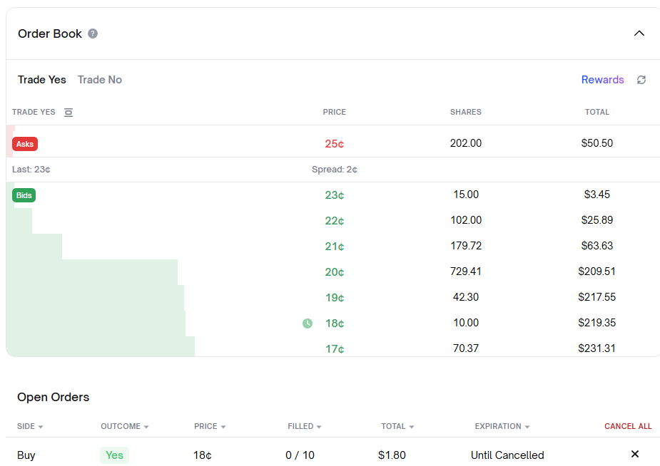我在一個交易較不活躍的市場掛了一個 YES 的買單,價格為 18,數量為 10: