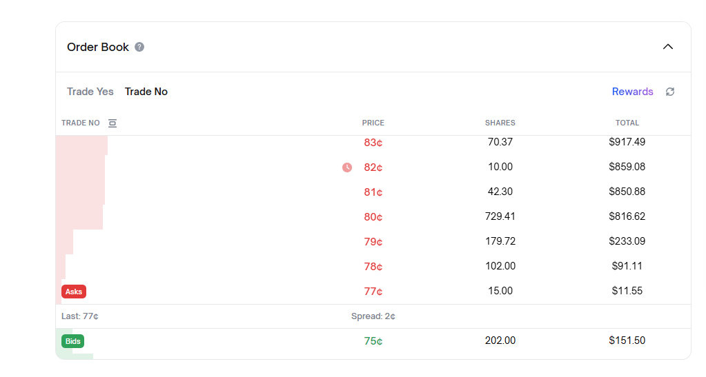 你看其他價位也可以一一對應上,價格就是公式:YES + NO = 1,當然 18 對應的就是 0.18,82 對應的就是 0.82,這裡顯示成兩位數是方便讓大家理解這是概率。