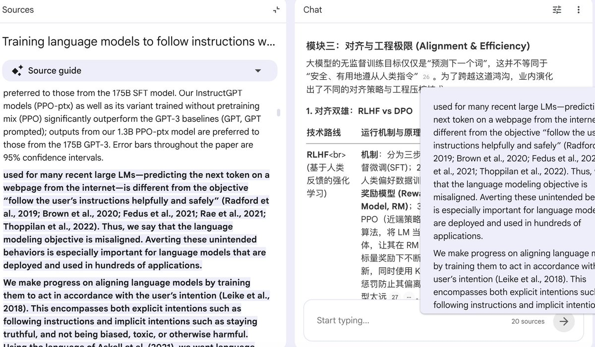 你可以先在 Notebooklm 問一些比較簡單、直覺的問題,然後將你的理解與其他 AI 討論和探討,之後再把結論發給 Notebooklm,讓它去反駁、論證、補充和糾正。