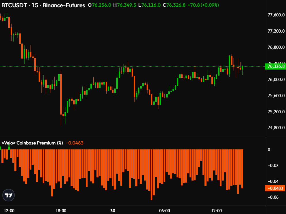 - 比特幣在 76K 美元附近盤整,Coinbase 期權費走弱顯示機構參與趨於謹慎。