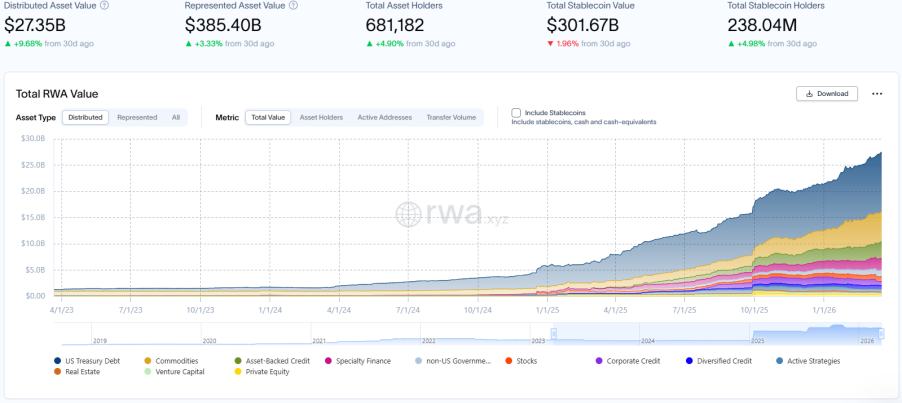 RWA.xyz 最新數據披露,截至2026年3月20日,RWA 鏈上總市值達 273.5 億美元,環比上月同期大漲 9.68%;資產持有者總數增至約 68.12 萬,環比上月同期增加 4.9%,與 RWA 規模增速匹配。