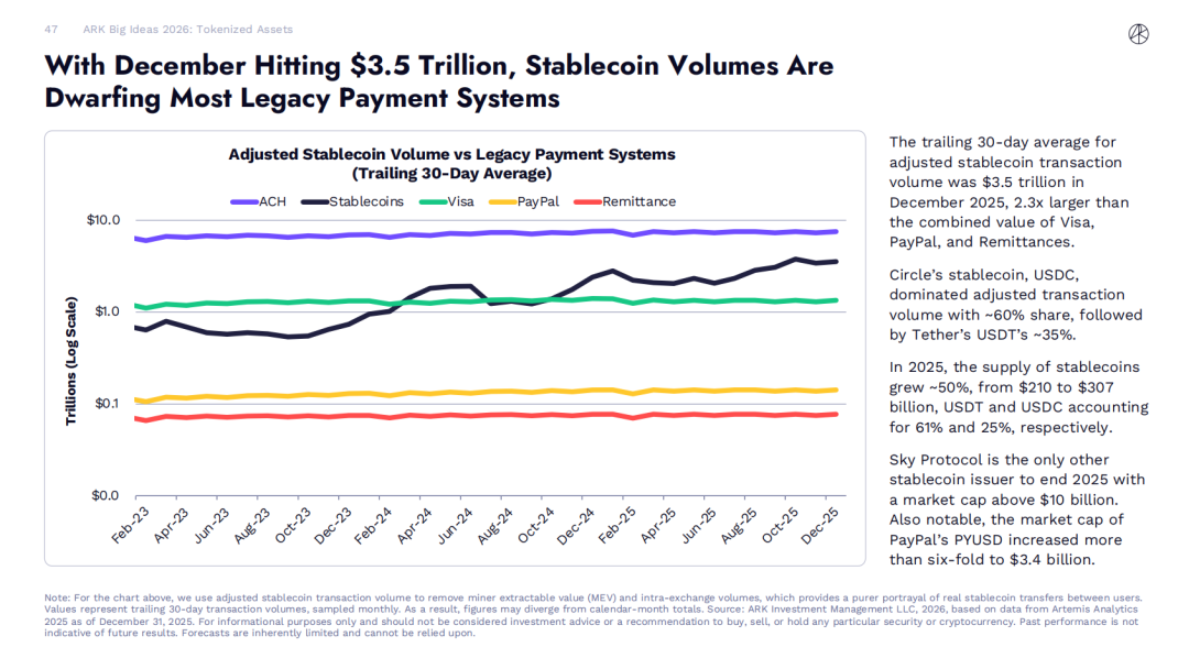 ARK Invest 2026 年十大投資概念數據顯示:2025 年 12 月,調整後穩定幣交易量的 30 日移動平均值為 3.5 兆美元,是 Visa、PayPal 及匯款業務總和的 2.3 倍。