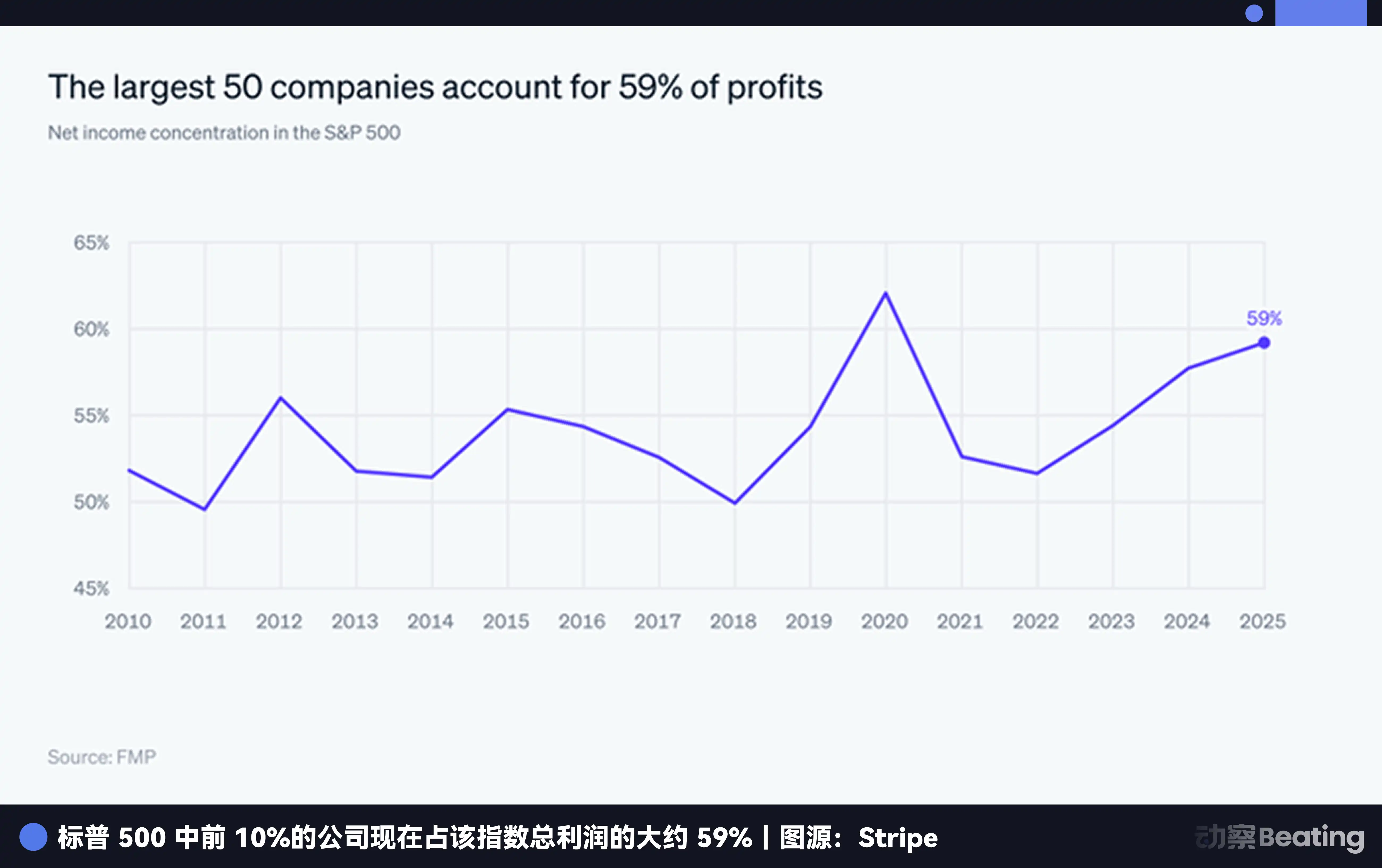 Stripe 在信中引用了一組數據:美國盈利能力最強的 1/3 上市公司,拿走了整個股市 2/3 的市值,這是自 1963 年有數據以來的最高比重。摩根大通在 2026 年初的展望中也講述了贏家通吃的現狀,指出市場過度集中的情況。標普 500 裡 10% 的頭部公司,貢獻了 59% 的利潤。