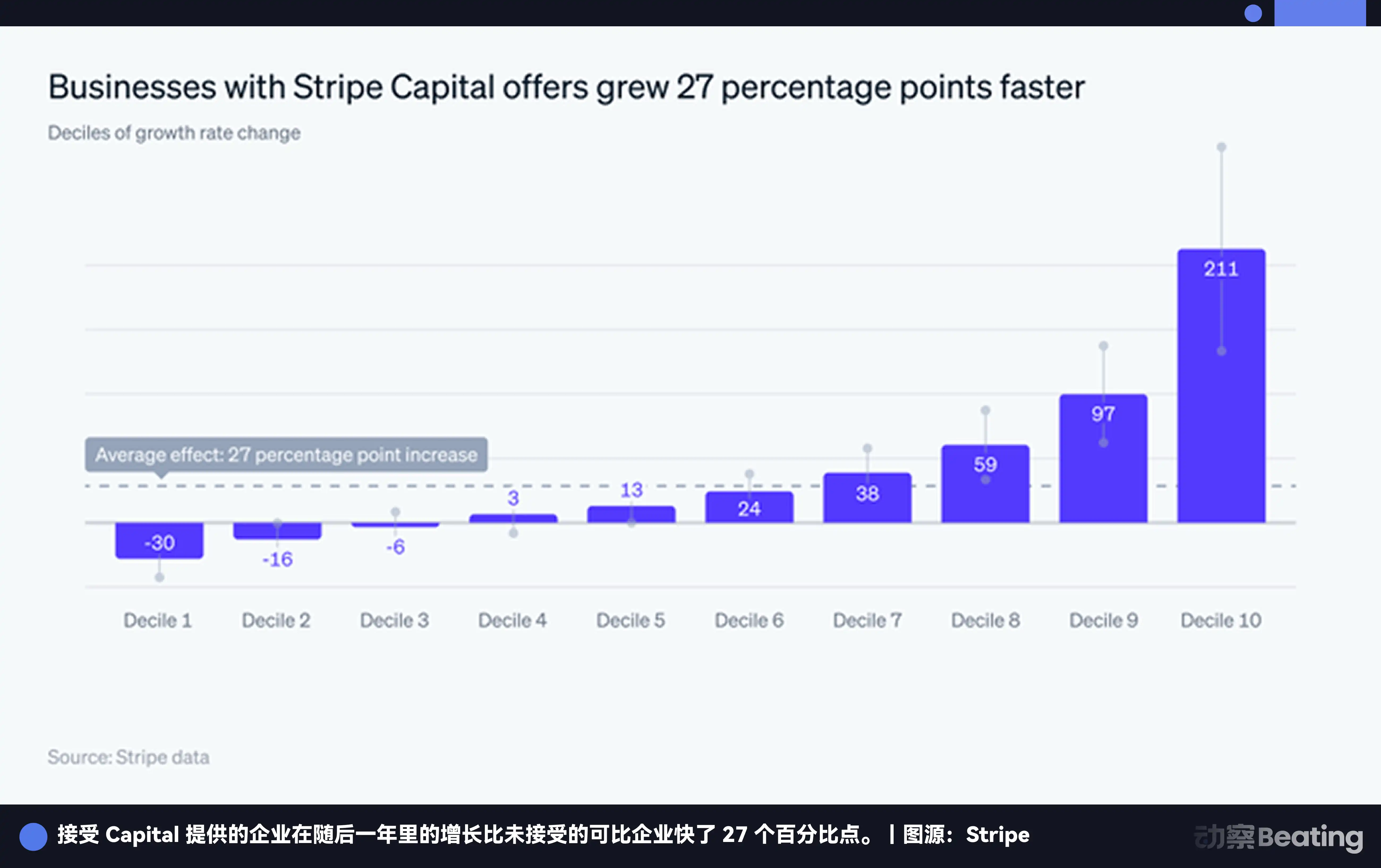 Stripe Capital 的邏輯是,我擁有你所有的交易數據,比任何銀行都更了解你的業務。它利用商家的實時交易數據提供貸款,繞過傳統銀行繁瑣的審批流程。獲得 Stripe Capital 融資的企業,接下來一年的增長速度比未獲得融資的同類企業快了 27 個百分點,最快的一檔甚至快了 3 倍以上。