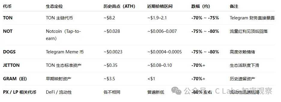 當年爆紅的TON生態項目,現在還能活躍的也不剩幾個了,幣價普遍回調70%以上: