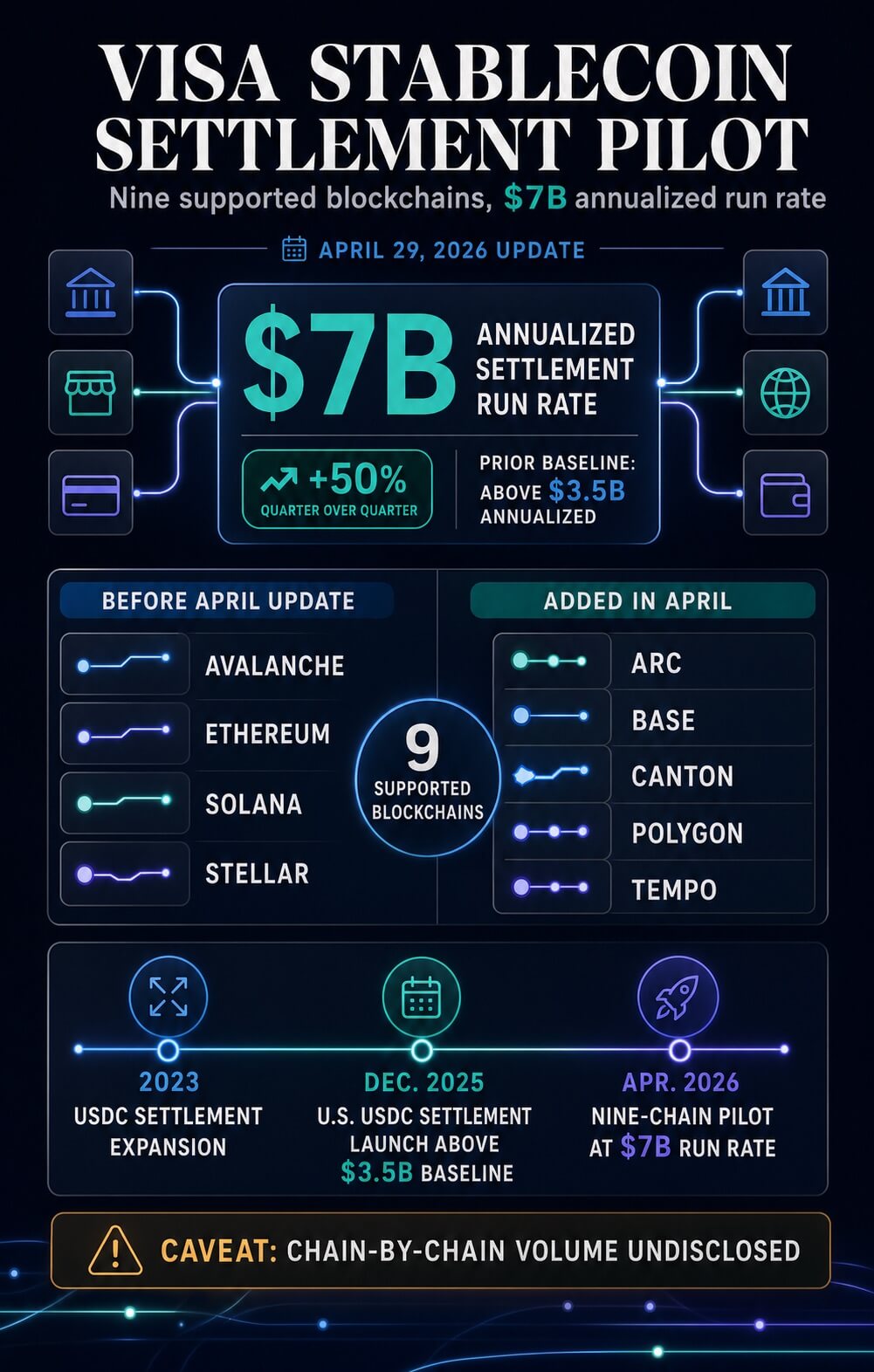 | Avalanche、以太坊、Solana、Stellar | Arc、Base、Canton、Polygon、Tempo | Visa 正在擴大在公鏈、支付導向網絡和機構導向基礎設施上的結算試點範圍。 |