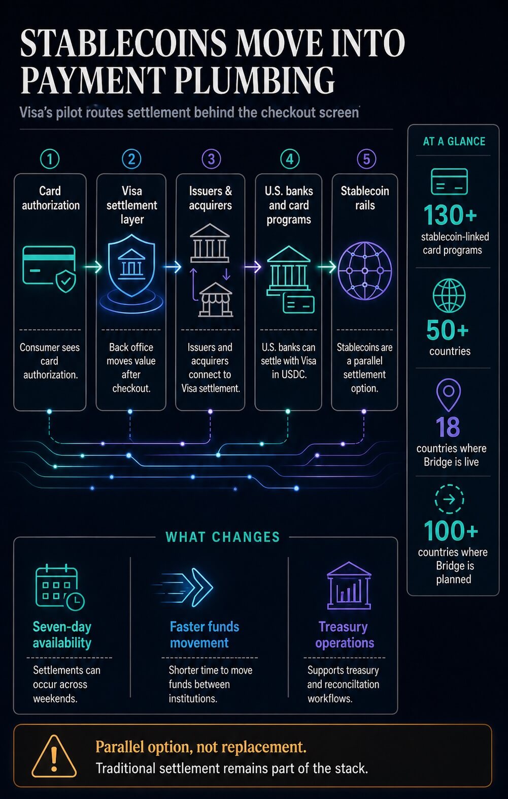 這使得該更新不僅僅是區塊鏈支援清單,更是一種結算基礎設施的信號。維薩正在測試穩定幣是否能成為支付基礎設施中的一種並行結算選擇,而該基礎設施已覆蓋銀行、卡片計劃和各市場的商戶。